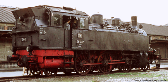 IIIa | 75 093 | DB, 2x DRG-Lampe, Aufbau schwarz, Fahrwerk rot, Rauchkammerring genietet, Kohlekasten trichterförmig und hoch, mit Bretteraufsatz |