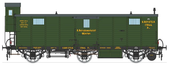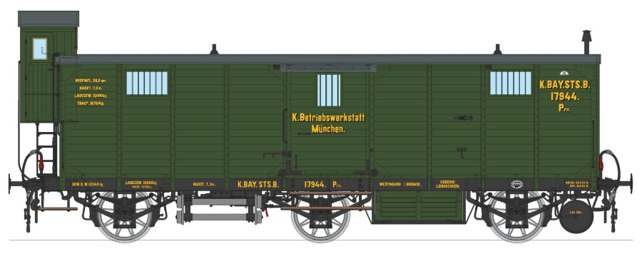 Die Königlich bayerische Staatsbahn beschaffte ab 1902 auch 3-achsige sogenannte „Hilfs- & Requisitwagen" die unter der „Serie Prn" geführt wurden. Ausgestattet waren diese mit einer Werkbank, Seilwinden, Hebern und anderen Werkzeugen. Sitzgelegenheiten und Ofenheizung für die Arbeiter waren ebenso vorgesehen. Am Rahmen waren zusätzliche, abnehmbare Achsen mit kleinen Laufkreisdurchmesser eingehängt, die zum verschieben verunfallter Fahrzeuge dienten. Eine Gasbeleuchtung stellte auch ein Arbeiten bei Nacht sicher. Wie lange diese Werkstattwagen in Dienst waren, können wir nicht mit Sicherheit sagen; da diese aber oftmals ein sehr langes „Leben" hatten, bieten wir sie auch in der Epoche 2 und Epoche 3 an.