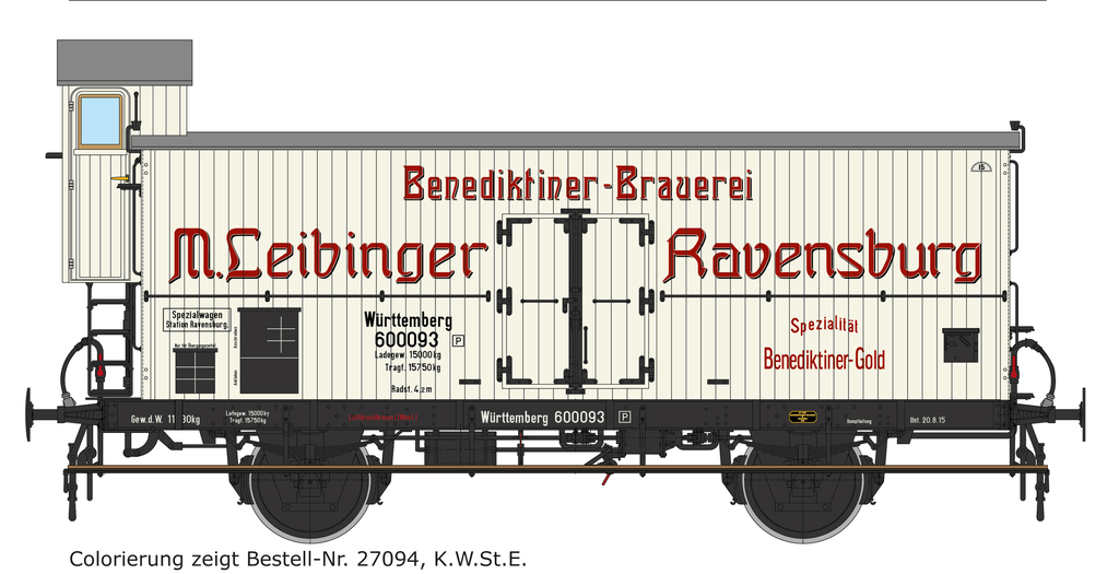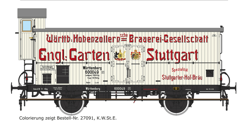 | 27094 (-N/-F/-P) | 1 | K.W.St.E., weiß/schwarz, seitliche Fußtritte in Wagenlänge, Scheibenradsätze, Stangenpuffer und Doppelhaken-Kupplung, Bauzustand 1909, rote Werbe-Anschriften mit Schatten |