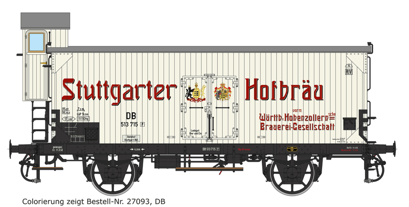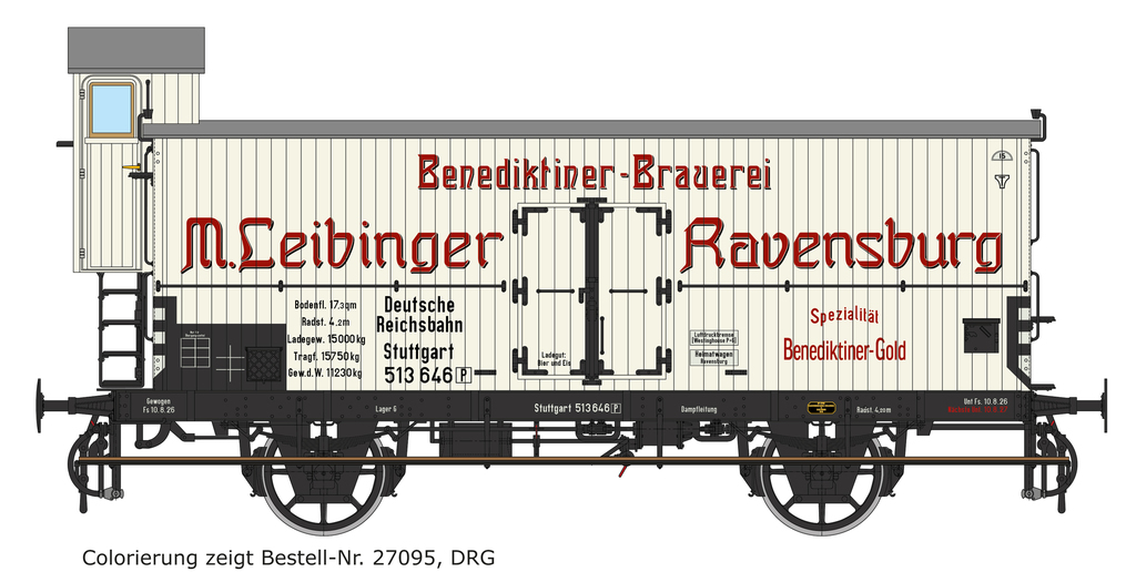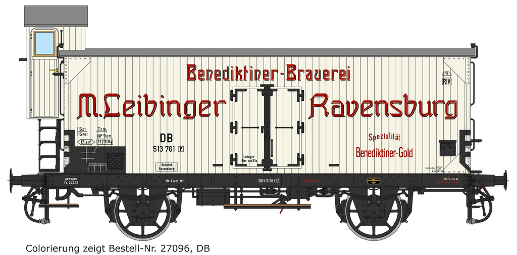 | 27095 (-N/-F/-P) | 2 | DRG, weiß/schwarz, seitliche Fußtritte in Wagenlänge, Einfach-Speichenradsätze, Stangenpuffer und Doppelhaken-Kupplung, Bauzustand ca. 1926, rote Werbe-Anschriften mit Schatten |