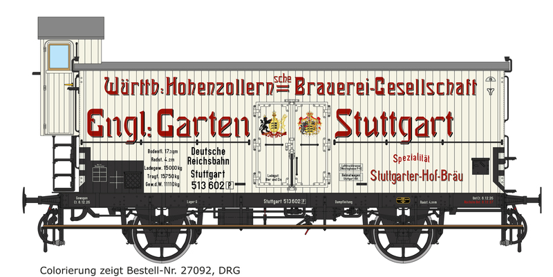 | 27092 (-N/-F/-P) | 2 | DRG, weiß/schwarz, seitliche Fußtritte in Wagenlänge, Einfach-Speichenradsätze, Stangenpuffer und Doppelhaken-Kupplung, Bauzustand ca. 1926, rote Werbe-Anschriften mit Schatten |